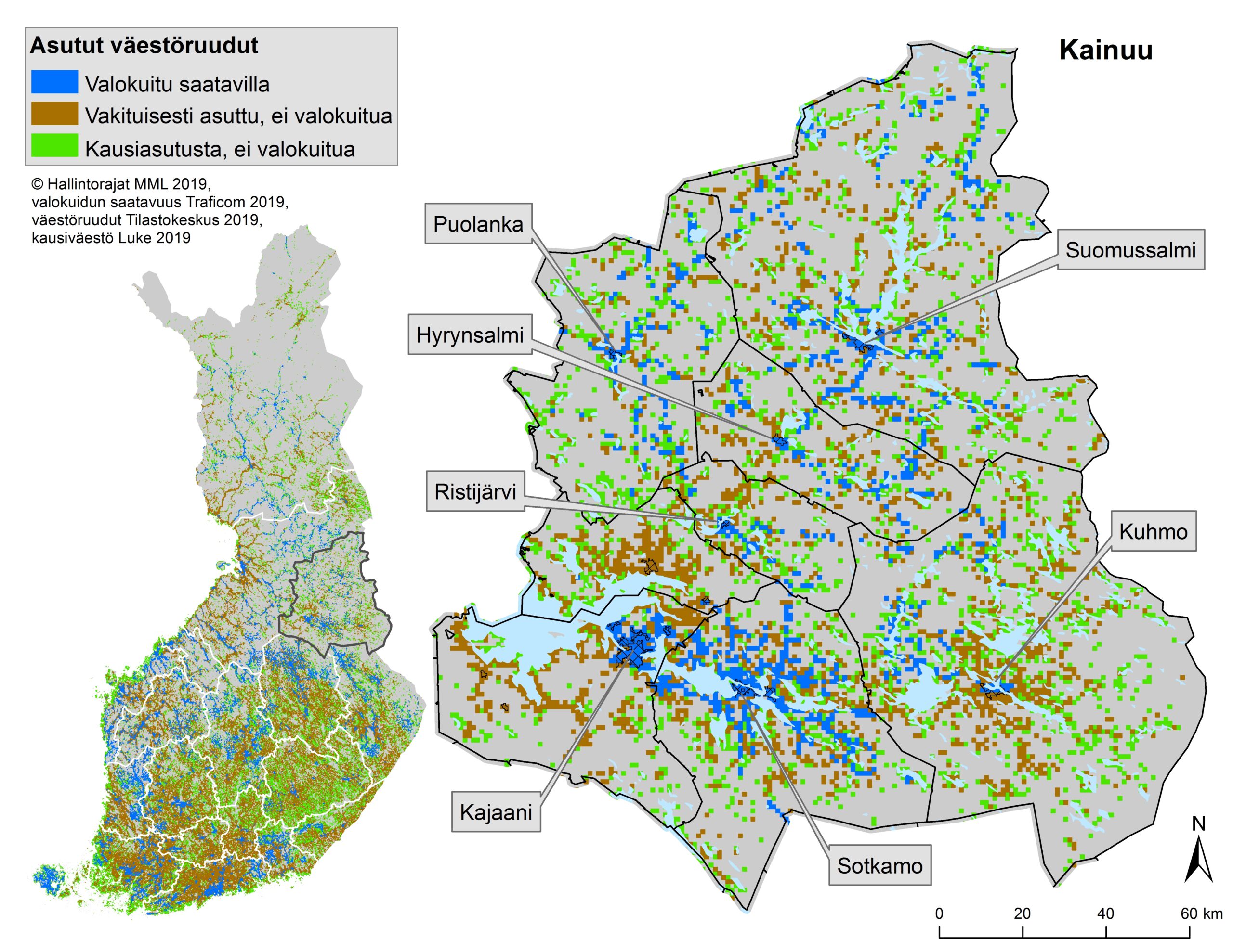 Siikaverkko Cooperative (in Finnish)We have built fixed fibre connections with national funding in Kainuu since 2011. The availability of fibre optic network in the end of 2019 covered 32% of the households in Kainuu. Counting all the fixed connections, the availability rate (Download ≥ 100 Mbit/s) rises to 58 %. Wireless connections complement the fixed network in and around Kainuu, so the coverage of fast broadband connections is good.