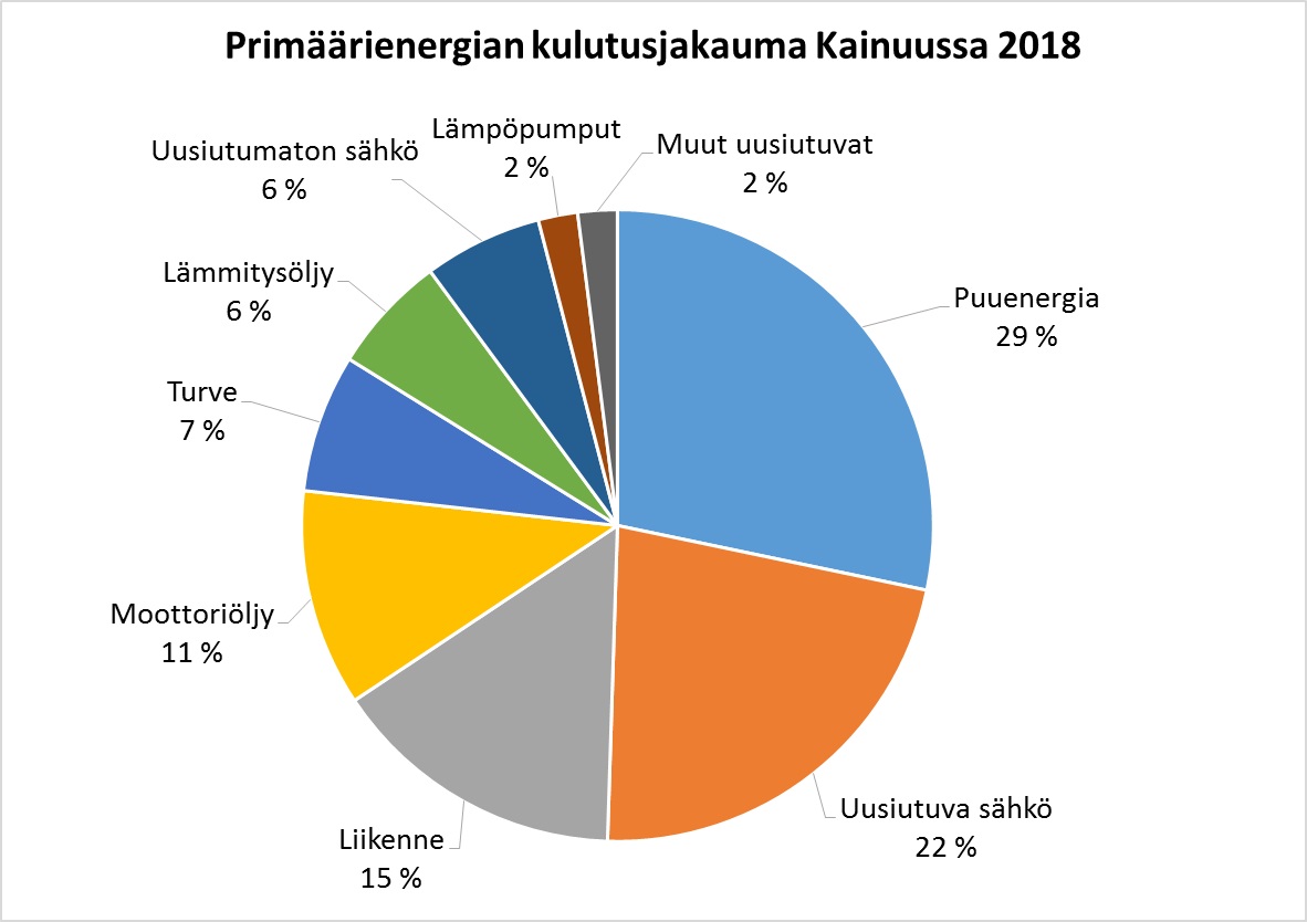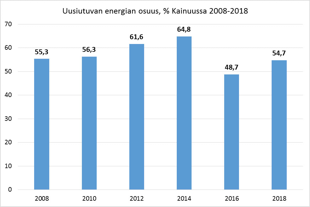 Uusiutuvan energian osuus nousi vuonna 2018 peräti kuusi prosenttiyksikköä ja päätyi 55 prosenttiin. Tämä johtuu uusiutuvalla energialla tuotetun tuontisähkön lisääntymisestä, öljyn käytön vähenemisestä lämmityksessä sekä uusiutuvan tuulisähkön tuotannon kasvusta Kainuussa. Kivivaara-Peuravaaran tuulipuisto tuotti 30 tuulivoimalalla sähköä 290 GWh. Kainuusta on tulossa merkittävä uusiutuvan energian tuottaja.