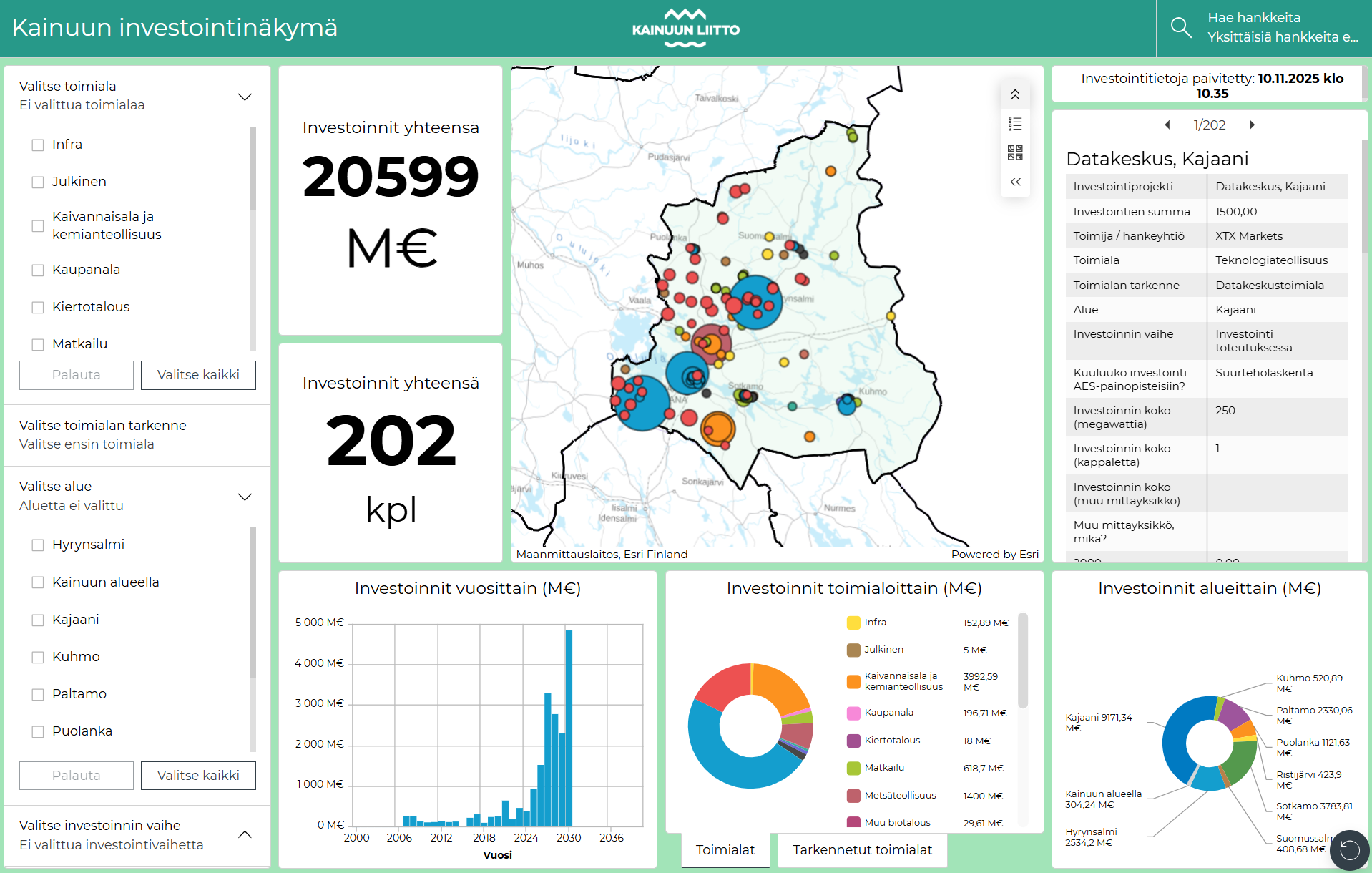 Kainuun investointien paikkatietopohjaiseen (ArcGIS dashboard) dataikkunaan pääset tästä linkistä:Kainuun investointien dataikkuna