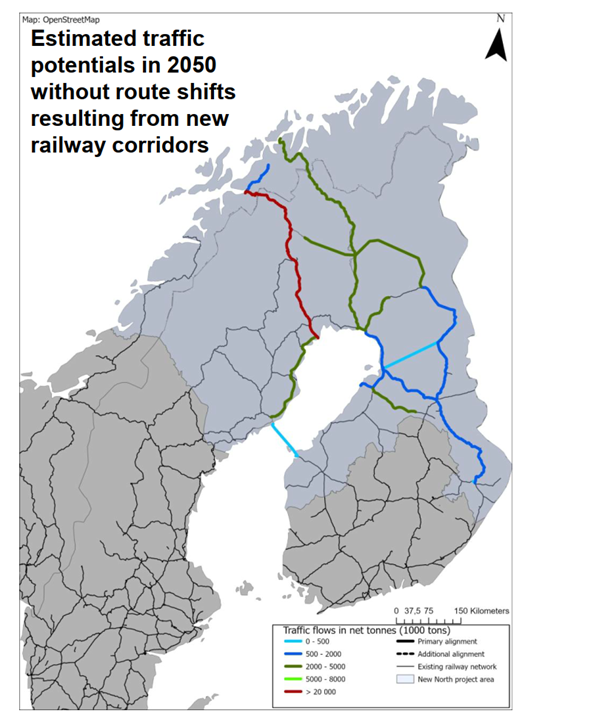 Rautatiekuljetusten tuleva kasvu New North -alueella perustuu ennen kaikkea kaivos-, metsä- ja muuhun teolliseen toimintaan. Rautatie soveltuu erityisen hyvin raskaiden ja suurivolyymisten tavaroiden kuljettamiseen, ja sen rooli vahvistuu, mikäli alueelle suunnitellut investoinnit toteutuvat.